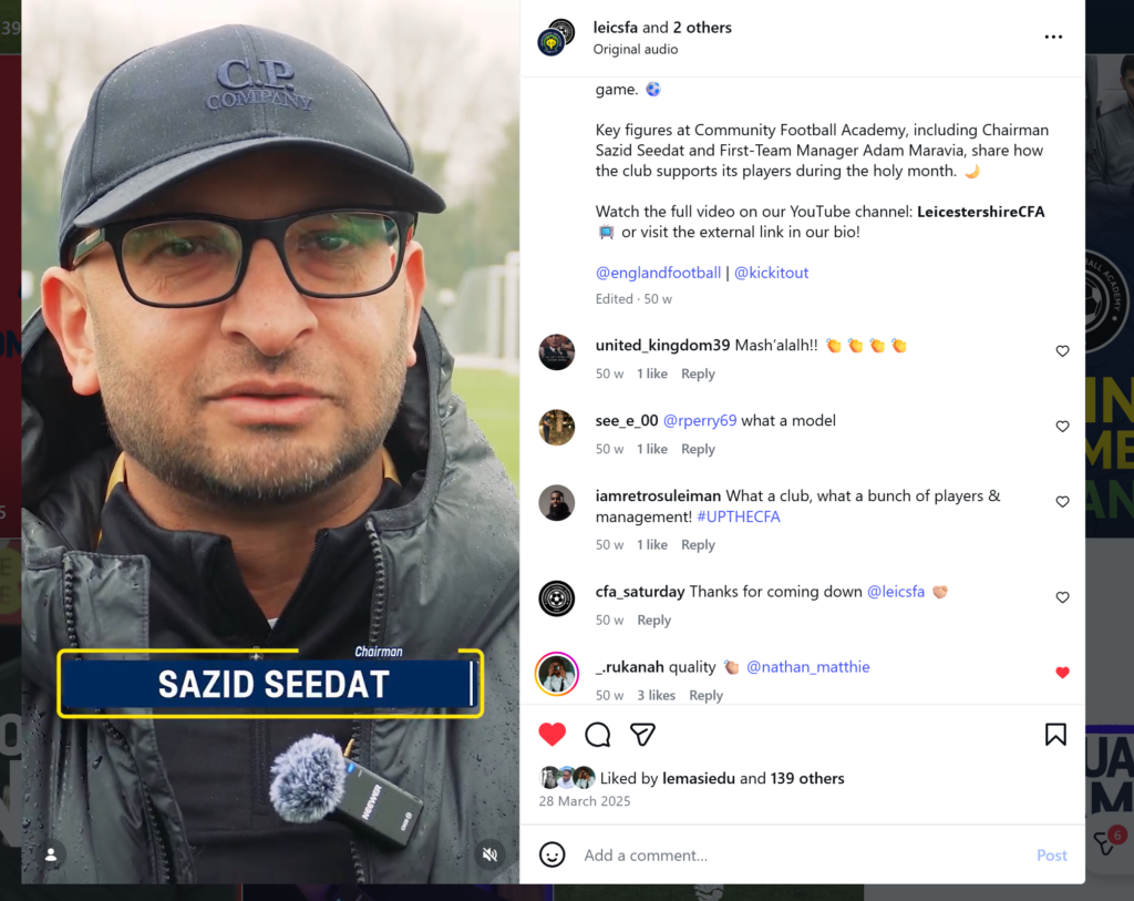 The project combined video storytelling with written content to maximise reach and engagement across multiple platforms. The video feature was supported by a website article that explored the experiences of Muslim players at Community Football Academy during Ramadan, providing additional context and key quotes from the interviews.